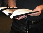 Rafael brought a DIY 6-voice Photo-theremin embedded in a book. Open & close the lid, make noises. I couldn't believe my eyes and ears. It drew quite a crowd. |
