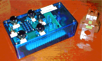tone, and the placement of your hand (or rather, the shadow of your hand) near the device affected pitch. This single-oscillator thingy sounded amazing once processed (sound sample has some very wet reverb and delay added)...sounds just like a '60s sci-fi movie. Plus it had knobs available for tweaking the pitch manually, and LFO rate and depth adjusters (an LED light blinked in time with the LFO modulation). Finally, the LFO could be switched between triangular (natural sounding vibrato; think of an American siren) or square (now think of a British siren). These effects were all monkeyed with in the sound sample. I got mine directly from "Professor Television" himself on eBay for around thirty bucks, which is the only option to track one of these rarities of a bygone age down, since his site has long since disappeared... |