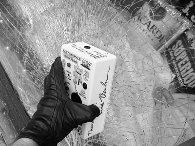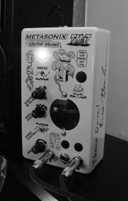 You might notice that Metasonix pedals are brick-like in girth. This is due to the fact that they use good, old-fashioned components that heat up after a bit of use, and take up a lot of room. The other thing is that an amply-weighted cabinet weeds out a lot of pussies. But one of the fringe benefits of this volumetrically advanced enclosure is that it can be used to smash the window of any available liquor store (see image).