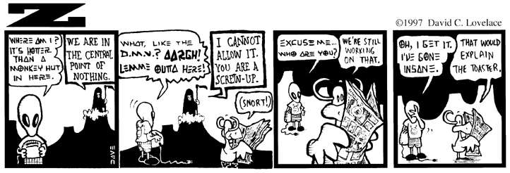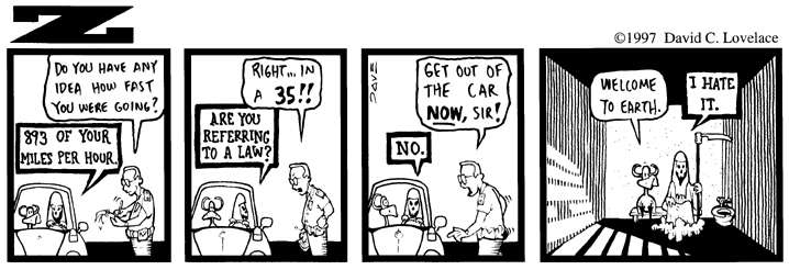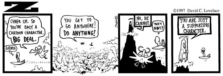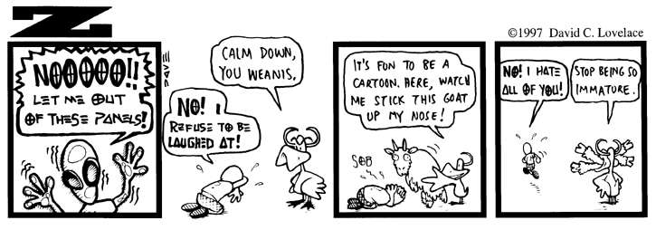 | Episode 1 -- A large, painted version of this is at Eli Cannon's, Middletown, CT Episode 2 -- Introductions Episode 3 -- Death isn't a verb, it's a noun. Oh, well Episode 4 -- Semantics Episode 5 -- Look at you! Episode 6 -- Twisted Episode 7 -- Confusing intro of the alien character Episode 8 -- The central point of Nothing Episode 9 -- Not alive Episode 10 -- Mass appeal! Episode 11 -- Vast mental powers Episode 12 -- "That's not my cheese!" Episode 13 -- Another toon, another Volkswagen! Episode 14 -- 893 in a 35 Episode 15 -- Nobody's perfect Episode 16 -- Smiling in traffic court Episode 17 -- You are all just cartoons! Episode 18 -- A warped creator Episode 19 -- You have no memories. Episode 20 -- No motivation... Episode 21 -- Wagon country Episode 22 -- The immature weanis Episode 23 -- Do anything! Episode 24 -- Be funny!! |